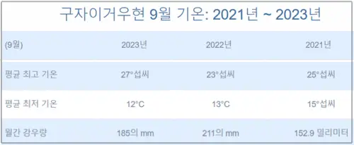 최근 3년간 9월 강수량을 살펴보면 2021년 153mm, 2022년 211mm, 2023년 185mm로 지속해서 증가하고 있습니다. 이는 전 세계적인 기후 변화의 영향으로 인해 구채구 지역의 강수량이 변화하고 있음을 의미합니다.