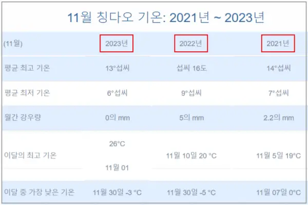 2023년과 비교하여 2024년 11월 중국 청도 날씨는 어떤 변화가 있을까요? 현지 기상청 예보를 참고하여 자세히 알아보겠습니다.